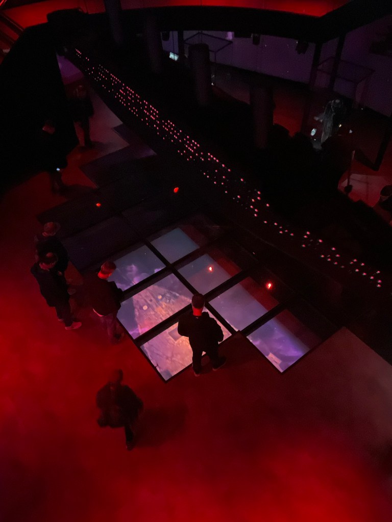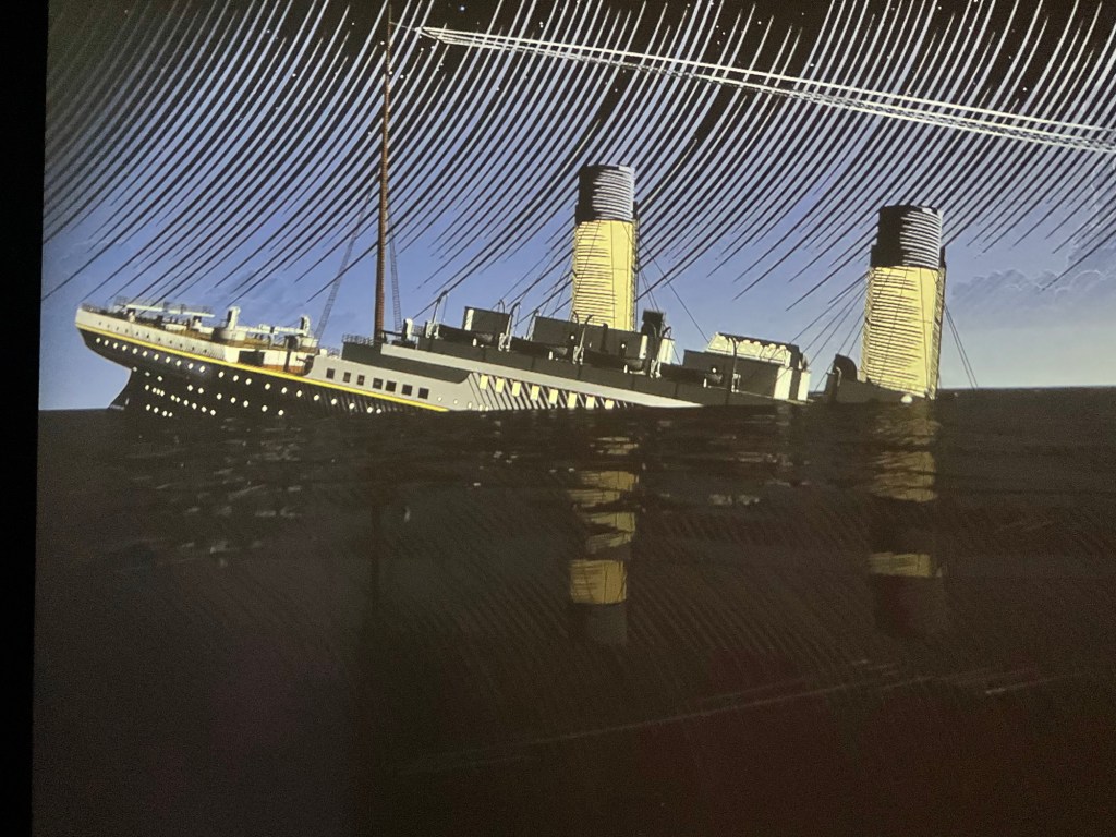 This was beautiful. The Titanic is circulating above with a light for each passenger slowly being extinguished, violin music being played in the background, the same musical piece that was played when the ship sunk. And in the glass below is the underwater images taken of the sunk ship.