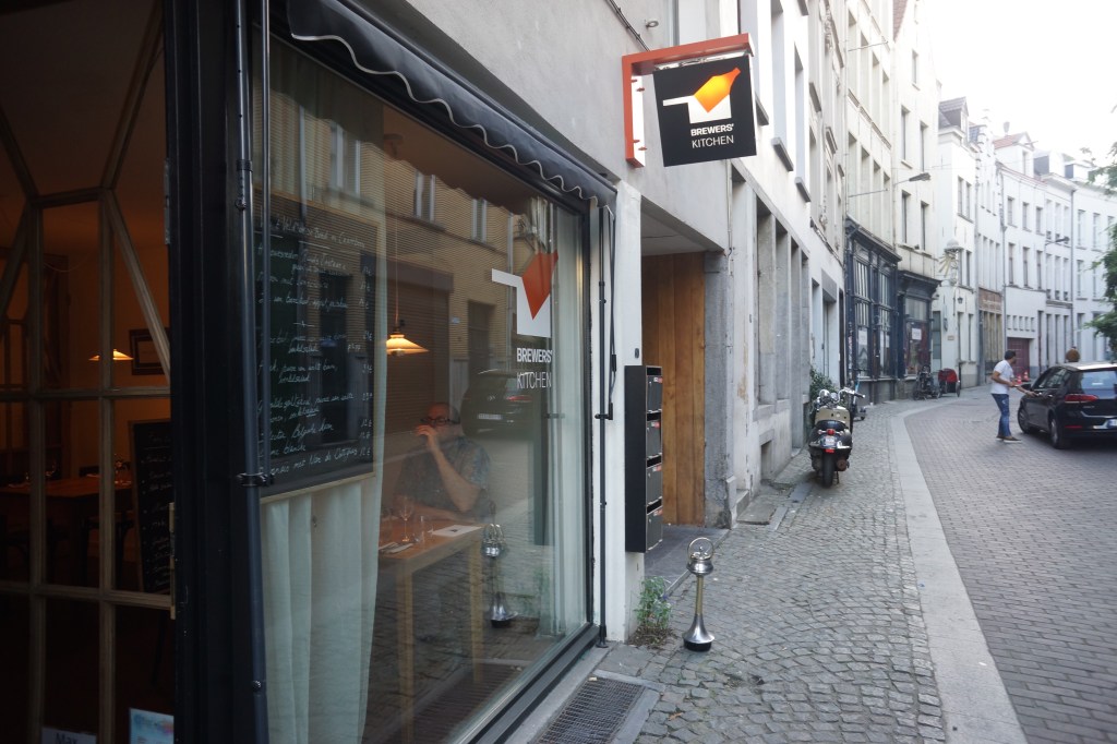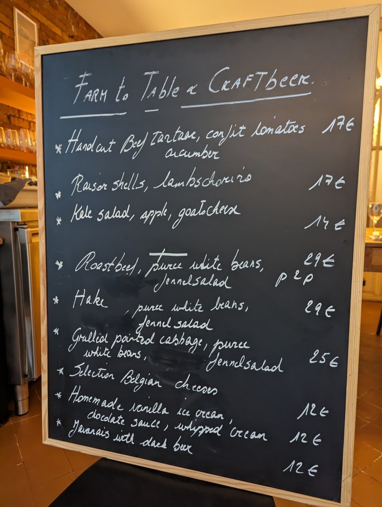 Our wanderings and trama of seeing so much tourist food in Antwerp brought us a delight, Brewers’ Kitchen. Farm to Table on the chalk board outside brought us in.